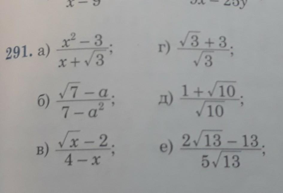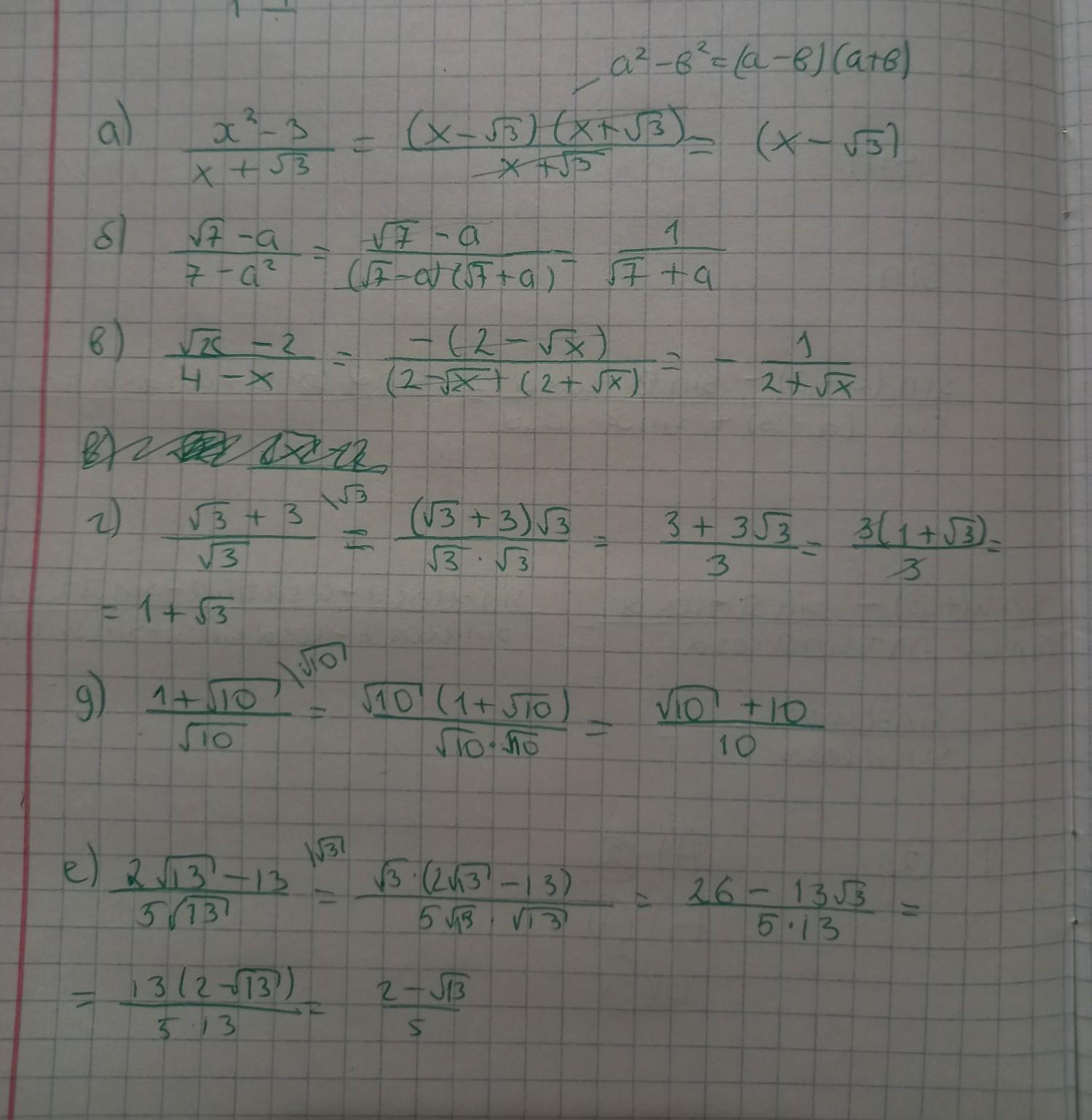 в примерах (а), (б), (в) мы применили фсу, а в (г), (д), (е) избавились от иррациональности ( числа с корнями в знаменателе) и сократили дробь