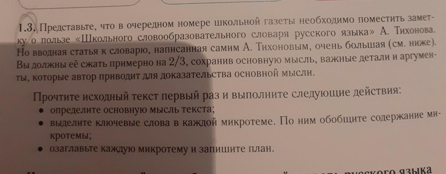 1.3. Представьте, что в очередном номере школьной газеты необходимо поместить замет- ку о пользе «Школьного словообразовательного словаря русского языка» А. Тихонова. Но вводная статья к словарю, написанная самим А. Тихоновым, очень большая (см. ниже). Вы должны её сжать примерно на 2/3, сохранив основную мысль, важные детали и аргумен- ты, которые автор приводит для доказательства основной мысли. Прочтите исходный текст первый раз и выполните следующие действия: • определите основную мысль текста; • выделите ключевые слова в каждой микротеме. По ним обобщите содержание ми- кротемы; • озаглавьте каждую микротему и запишите план.