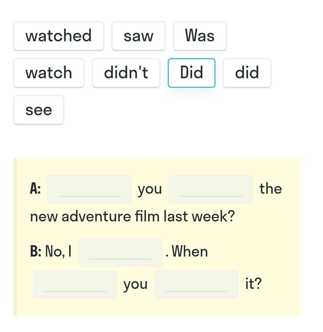 Ответ: A1) Did, A2)watched, B1)didn t, B2)did, B3)watch.