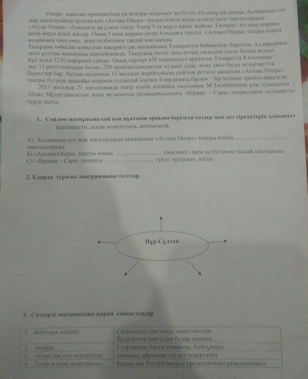 Б)"Астана опера "театры өзінің көлемімен ғана емес ,әсем келбетімен таңдай қақтырады