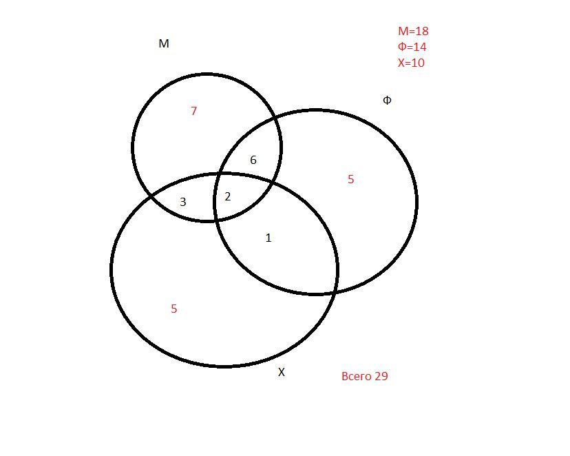 Каждый учащийся класса посещает какой-нибудь из кружков :математический, физический или химический. Причем математический кружок посещают -18, физический- 14,химический- 10.Кроме того известно, что все три кружка посещают 2 человека, математический и физический-8, математический и химический-5, физический и химический-3.Сколько ребят в классе?