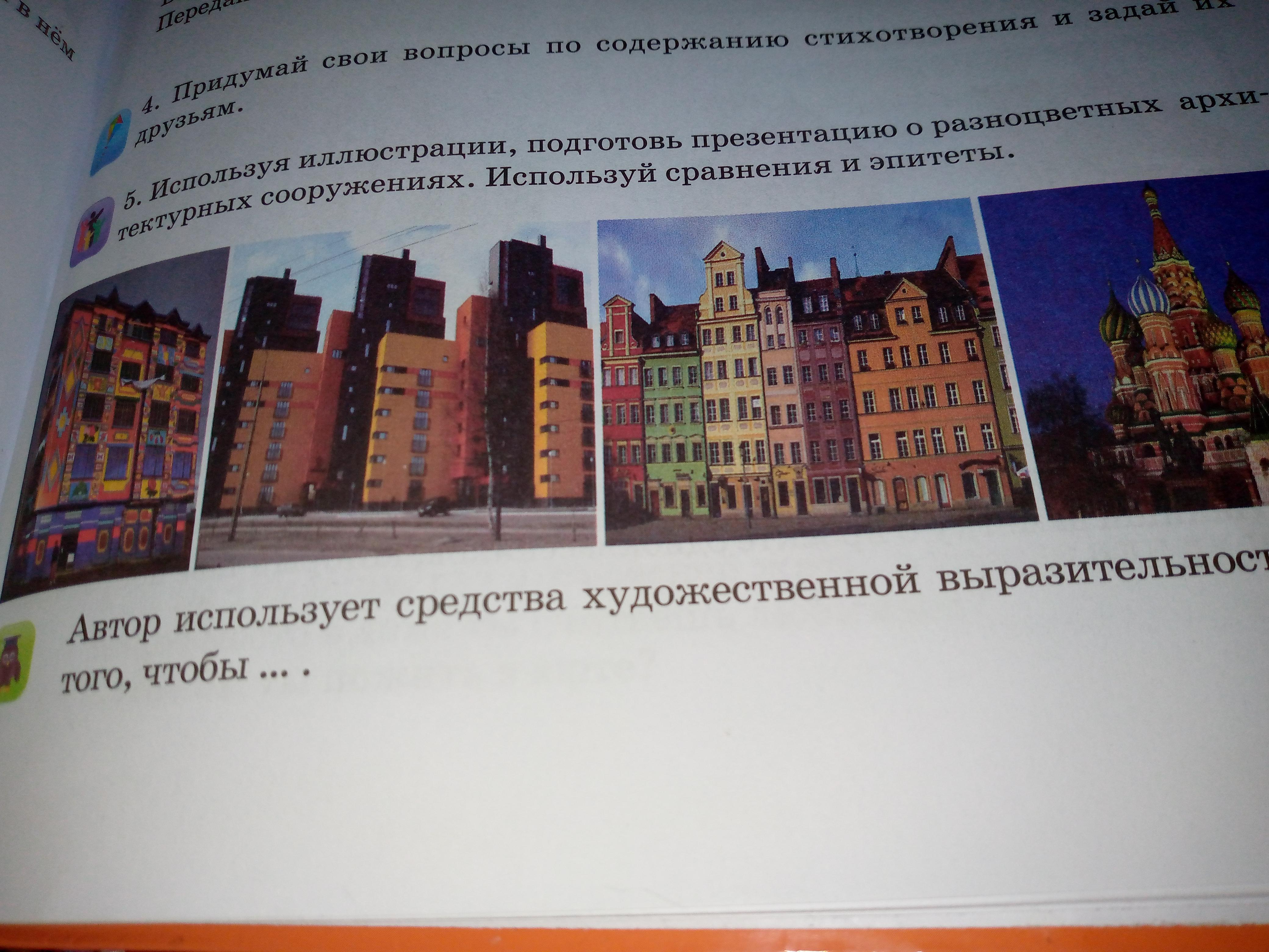 Пожалуйста помогите литер стр 71 упр 5. Условие: используя иллюстрации, подготовь презентацию о разнрцветных архитектурных сооружениях, используй сравнения и эпититы