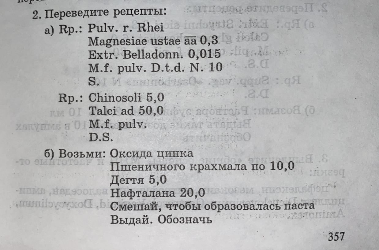 2. Translate de felis: a) Rp.: Pulv. r. Rhei a indo I: Xia (in Magnesiae ustae aa 0.3 fho Extr. Belladonn. 0,015 M. f. pulv. DtdN 10 8.a Rp.: Chinosoli 5.0 pi 01 Talci ad 50.0 DS b) Cape: cadmiae oxydi tritici amyli 10.0 Tar. Naftalan 20.0 logo.bi Misce ad farinam formandam da manum. Designare tA 357