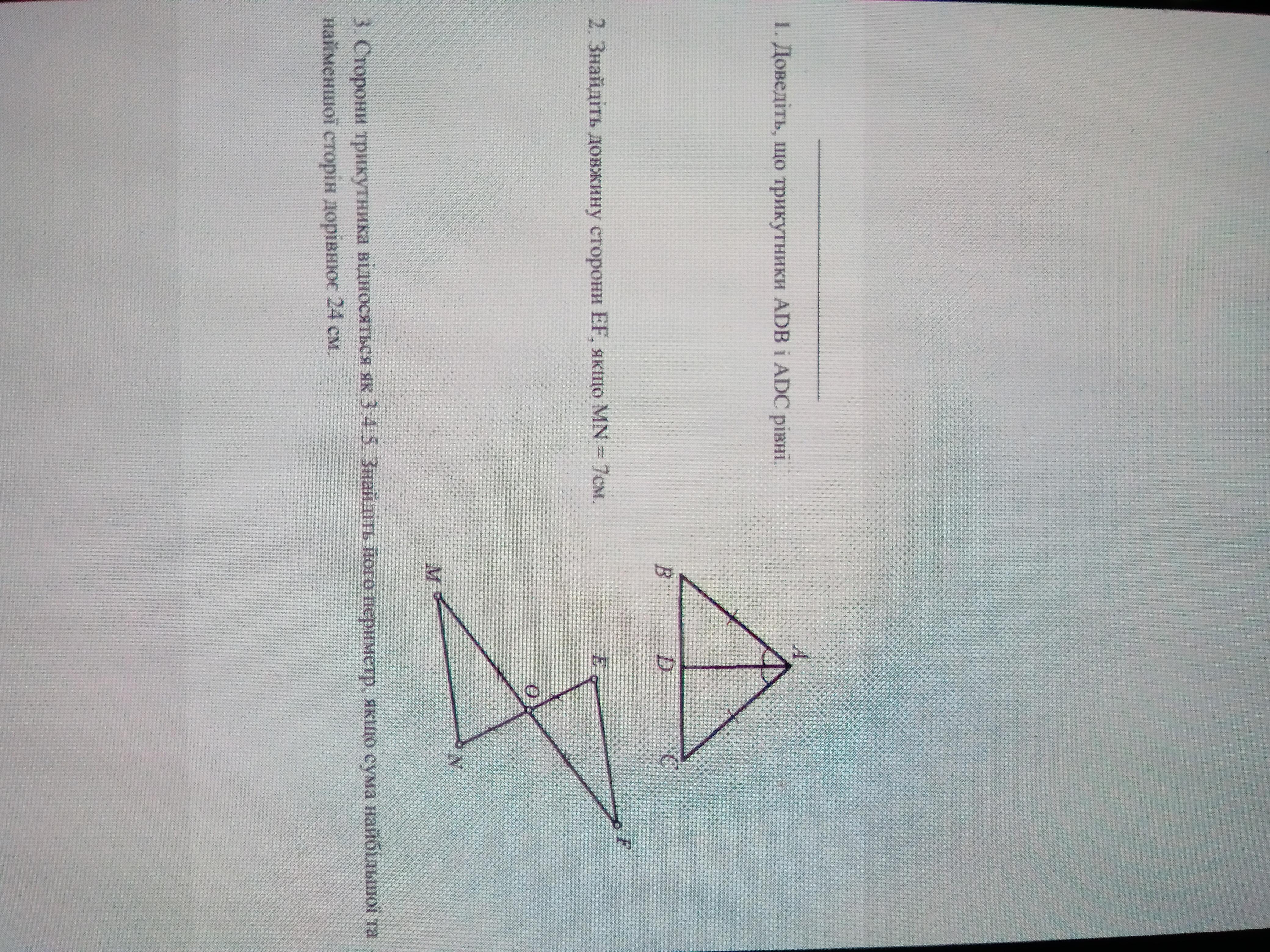 2. Так як вертикальні кути рівні ( тобто кут ЕОF = куту MON) а сторони ОЕ=ON, OF=OM, то трикутники рівні. За цією ознакою можна сказати що сторона EF=MN=7