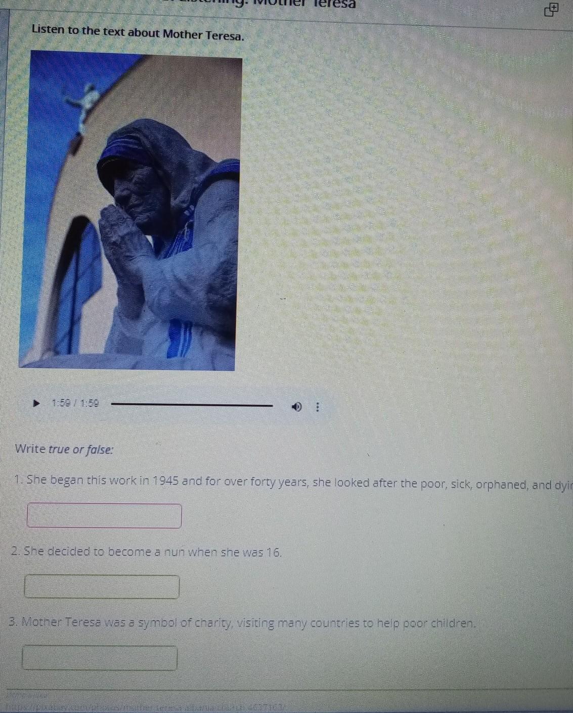 СРОЧНО ,ВОТ ТЕКСТ НУЖНО ВЫПОЛНИТЬ ПО НЕМУ ЗАДАНИЕ READ THE SCRIPT BELOW. Mother Teresa was born in Albania in 1910, and died in 1997. Her real name is Agnes GonxhaBojaxhiu. She became famous the world over for starting the Missionaries of Charity in Calcutta, India. She began this work in 1950 and for over forty years, she looked after the poor, sick, orphaned, and dying. She won the Nobel Peace Prize in 1979 for her humanitarian work. Agnes developed an interest in helping the less fortunate at a very young age. She was fascinated by stories of people who dedicated their life to help others. She decided to become a nun when she was 12. She joined the Sisters of Loreto as a missionary when she was 18. She initially went to Ireland, to learn English. She arrived in India in 1929 and became a nun two years later. The poverty and suffering she saw around her in Calcutta deeply disturbed her. A famine in 1943 killed thousands and worsened the situation. In 1946 she received a call from God. “I was to leave the convent and help the poor while living among them. It was an order,” she said. She was an international symbol of charity, visiting many countries to help poor children. At the time of her death, her organization was operating in 123 countries. After she died, the Pope started the process that might one day make her a saint. An international survey ranked her as the “most admired person of the 20th Century.”