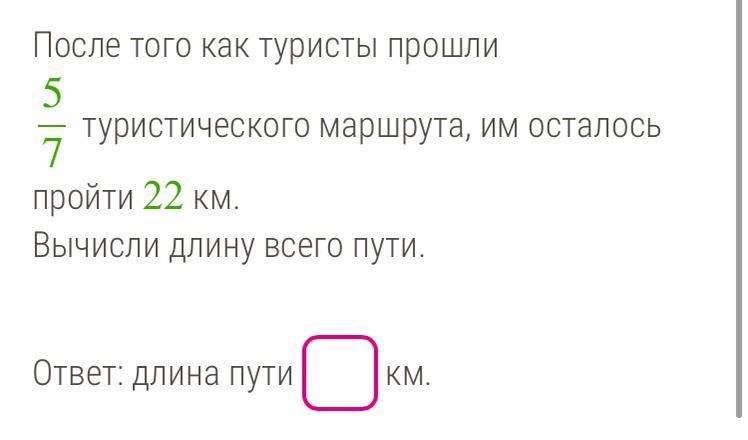 5/7 - сколько прошли, значит осталось 2/7. 2/7 - 22 км. Чтобы найти весь путь разделим 22 км на 2/7 и получим 77 км