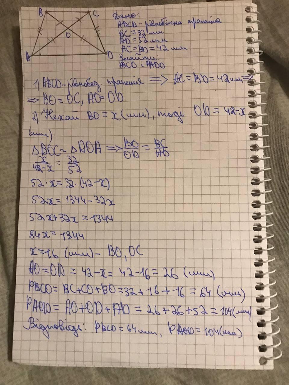 У рівнобічної трапеції ABCD основи ВС=32 мм і AD=52 мм. Діагоналі АС і BD дорівнюють по 42 мм і перетинаються в точці О. Знайдіть периметри трикутників ВСО і АDО.