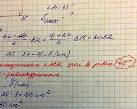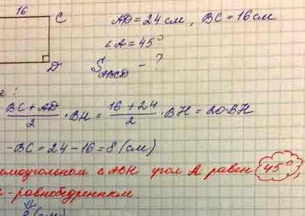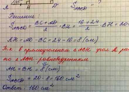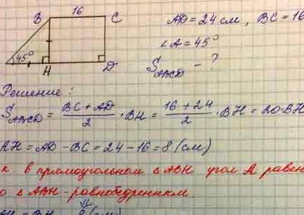 5. Вычислите площадь трапеции ABCD с основаниями AD и ВС, если AD = 26 см, ВС = 14 см, ZA=45°, ZD=90°.