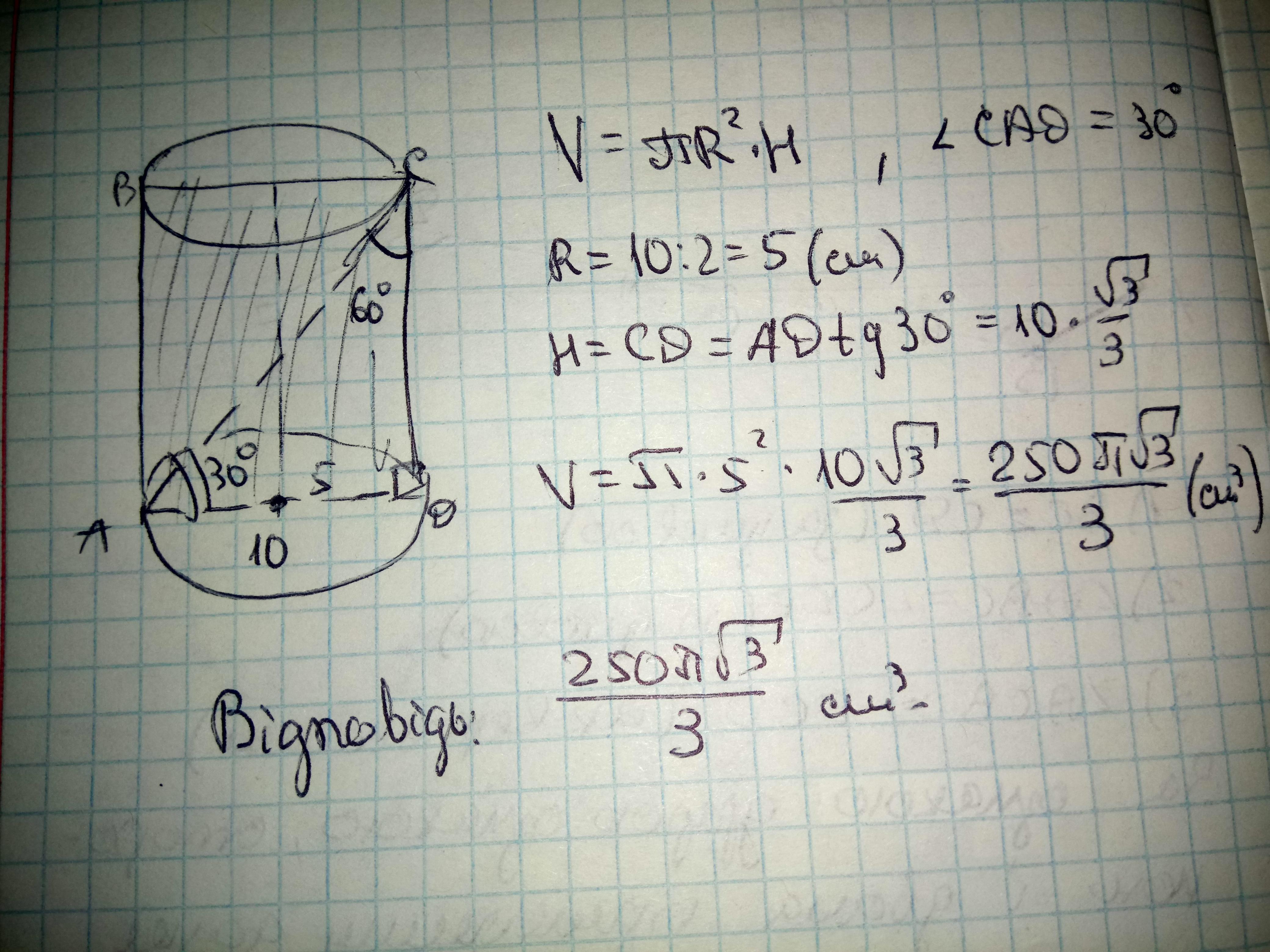 діаметр основи циліндра дорівнює 10 см а діагональ осьового перерізу утворює твірну кут 60°. знайти об'єм циліндра