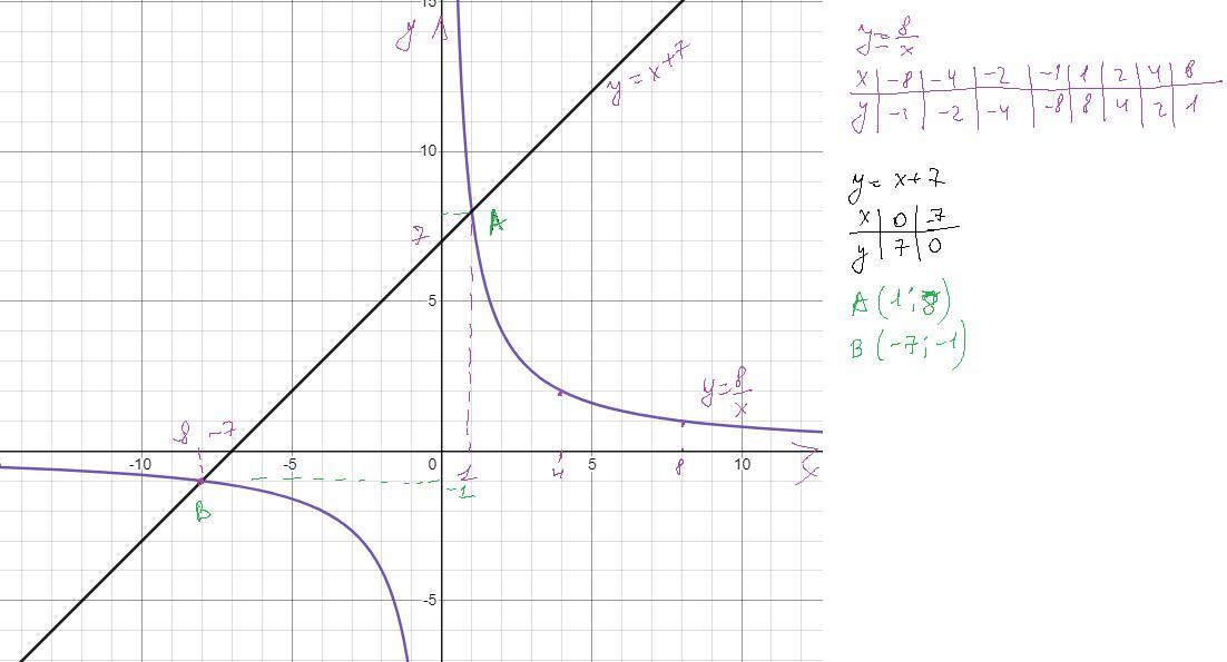Побудуйте в одній системі координат графіки функцій y = 8/x i y=x+7 та визначте координати точок їхнього