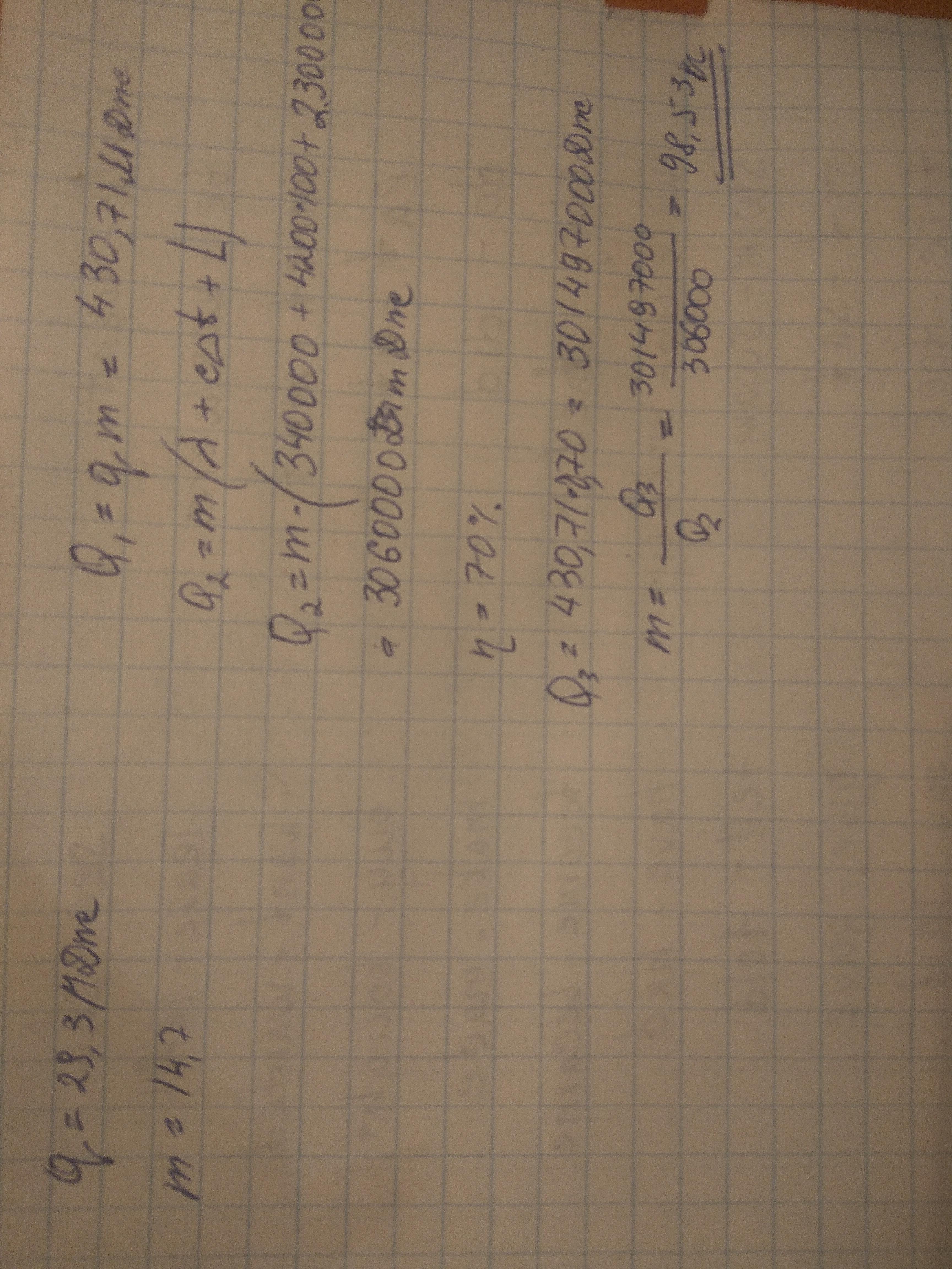 Помогите пожалуйста срочно!!!!даю 35 баллов!!!в печи растопили лёд и превратили в пар при температуре 100°C.какую массу льда растопили и превратили в пар,если затратили 14,7 кг каменного угля, начальная температура льда 0°C?КПД установки 70%