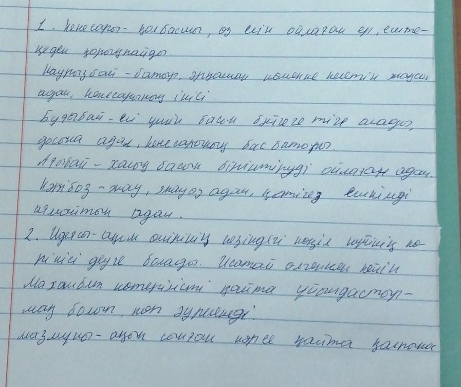 Нысанбай жыраудың «Кенесары – Наурызбай» шығармасы бойынша «Кейіпкерлерді зерттеу» кестесін толтырыңыз. Өз көзқарасыңызды 2-3 сөйлеммен білдіріңіз.
