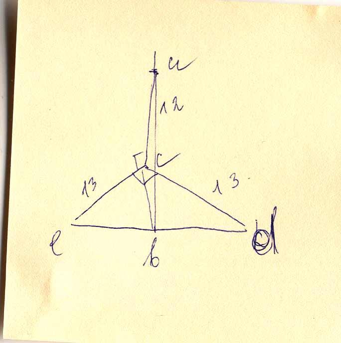 через вершину прямого угла с в равнобедренном треугольнике cde cde проведена прямая са, перпендикулярная к плоскости треугольника. известно, что ca = 12 дм, cd = 13 дм. найдите расстояние от точки а до прямой de