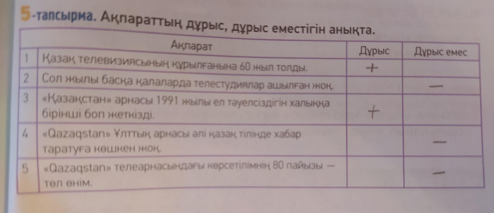 Дұрыс емес 5-тапсырма. Ақпараттың дұрыс, дұрыс еместігін анықта. Ақпарат Дұрыс 1 Қазақ телевизиясының құрылғанына 60 жыл толды. 2 Сол жылы басқа қалаларда телестудиялар ашылған жоқ. 3. «Қазақстан» арнасы 1991 жылы ел тәуелсіздігін халыққа бірінші боп жеткізді. 4 | «Qazaqstan» Ұлттық арнасы әлі қазақ тілінде хабар таратуға көшкен жоқ. 5 | «Qazaqstan» телеарнасындағы көрсетілімнің 80 пайызы төл өнім.