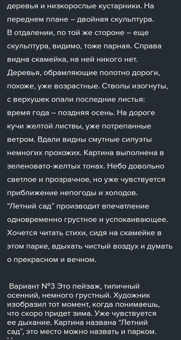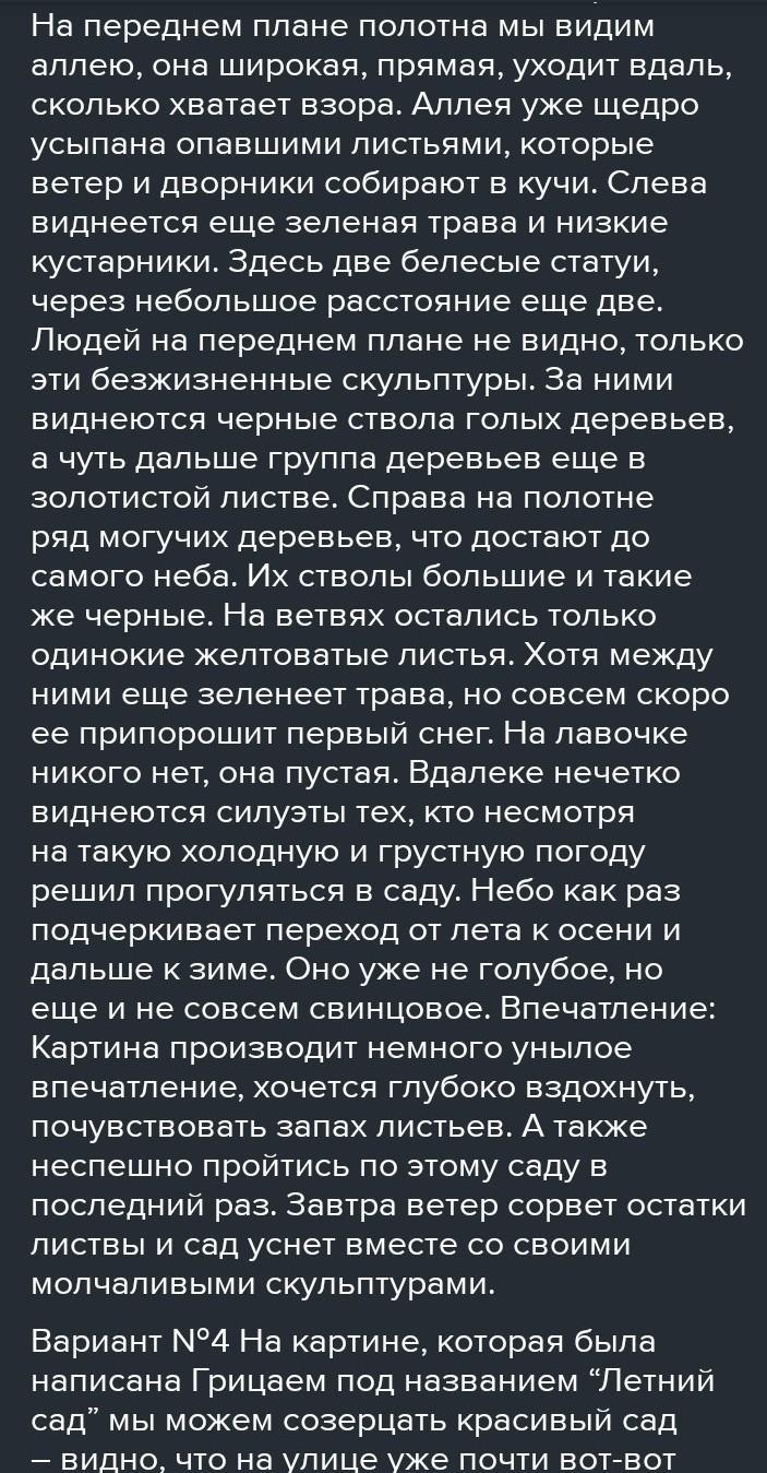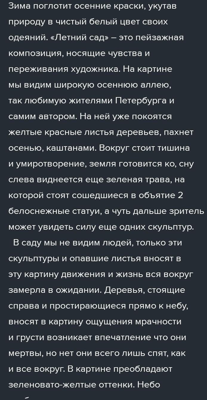 Ответ:Перед нами картина А.Грецкого"Летний сад". На данной картине автор изобразил позднюю осень в аллеи. Деревья уже сбросили свой летний наряд, а некоторые листья приняли желто-коричневый оттенок. По краям аллеи лежат упавшие листья с деревьев. Видимо, дворник не успел их еще убрать. Но от этого детям, гуляющим в парке, только веселее! Ведь они так приятно шуршат под ногами в такую пару года. Людей автор изобразил в глубине картины: там женщина, гуляющая с коляской и лавочки с отдыхающими прохожими. Наверное, это пожилые люди, которые пришли насладиться последними, в этом году солнечными осенними днями. На переднем-же плане картины Бродский изобразил тень от деревьев. На первый взгляд это обычная тень, но если всмотреться в эти незамысловатые линии, то эти переплетения веток, то сразу видно, сколько автор вложил в эту работу любви к природе. Справа на картине изображена небольшая, старая беседка. Сейчас она пуста, но если пойдет дождь, то в ней можно укрыться от него, чтобы потом продолжить прогулку по аллеи. Автор изобразил облачное небо с просветами. Облака будто предвещают, что скоро начнутся неспокойные дни. Краски, использованные А.Грецким, удивительно нежные, с бледным