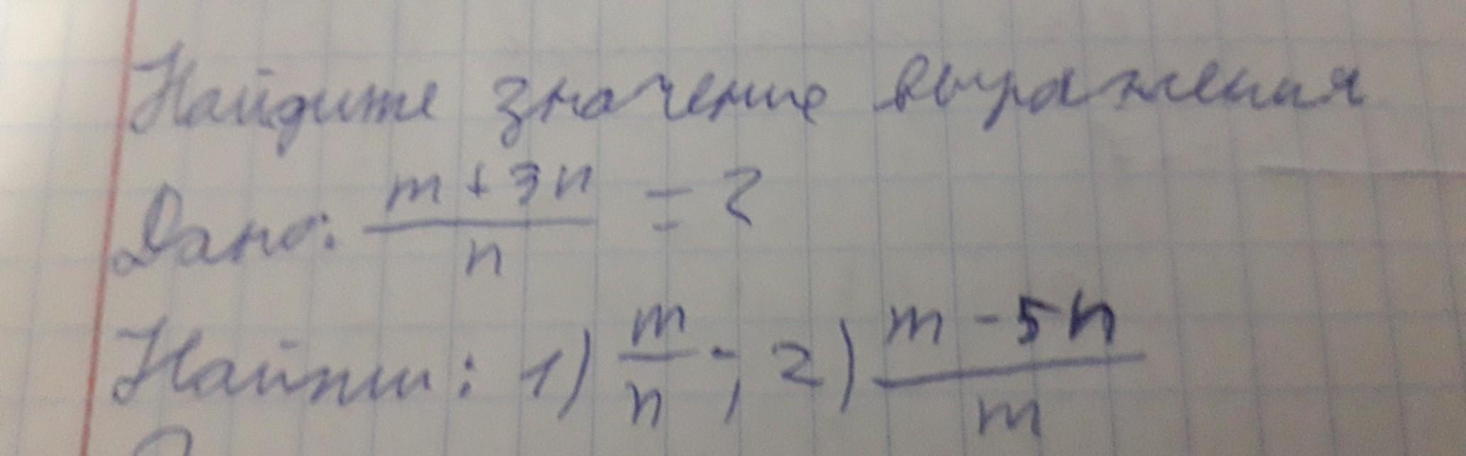 Дано: (m + 3n)/n = 2; m/n = ? (m - 5n)/m = ?