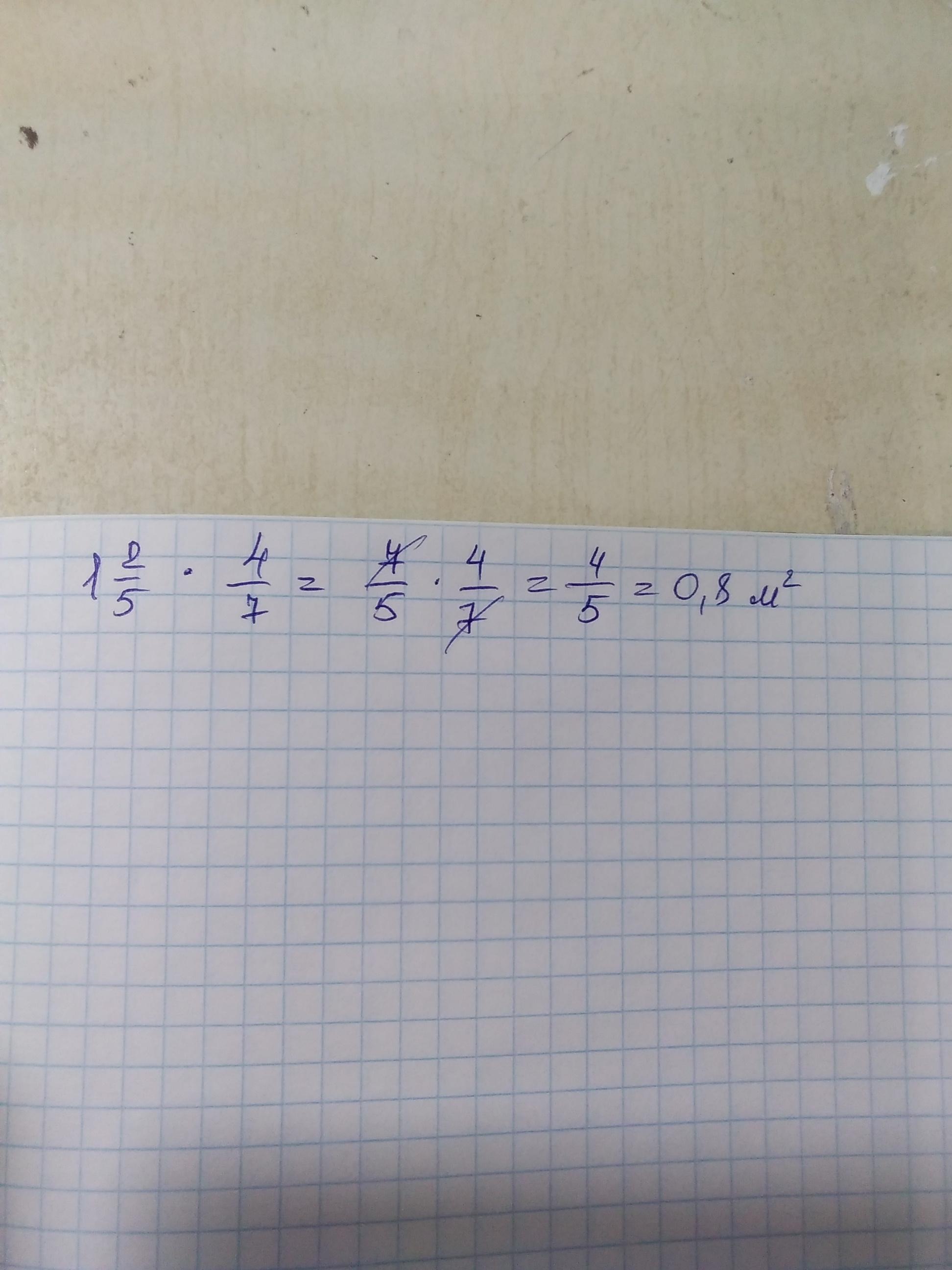 Длина прямоугольного стола — 1 2\5 м, а ширина — 4\7 м. Рассчитай площадь стола. (В ответе дробь сократи!)