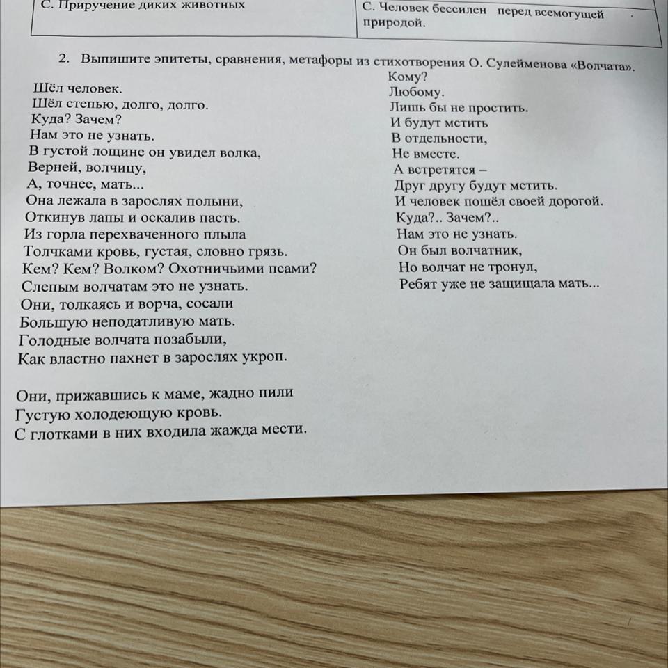 2. Выпишите эпитеты, сравнения, метафоры из стихотворения О. Сулейменова «Волчата».