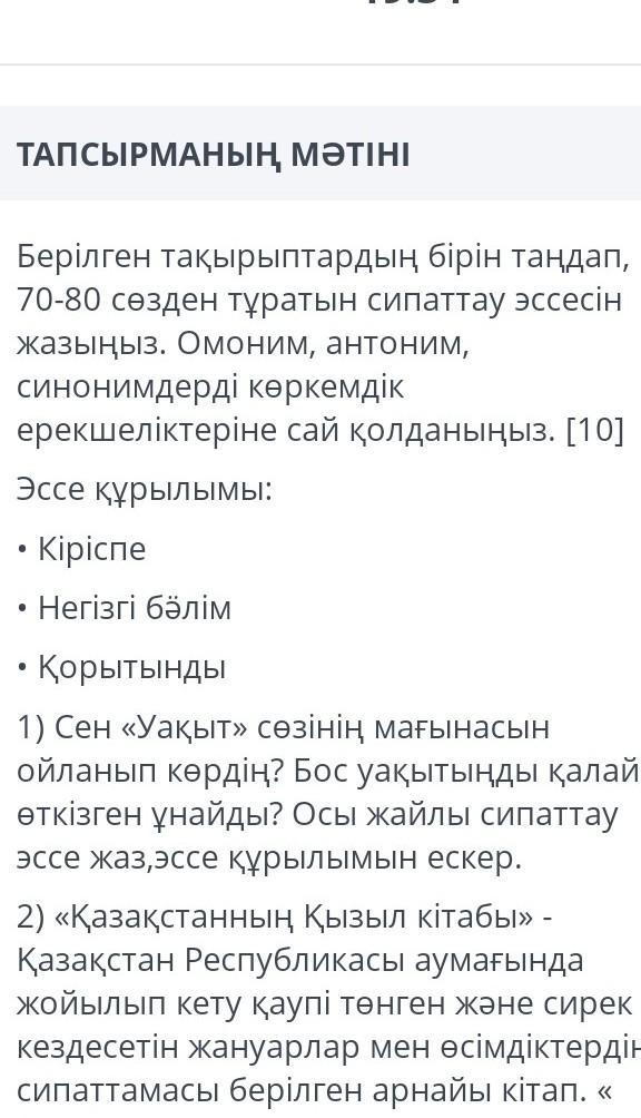 1) Сен <<Уақыт>> сөзінің мағынасын ойланып көрдің? Бос уақытты қалай өткізген ұнайды осы жайлы сипаттау эссесін жаз, эссе құрлымын ескер.