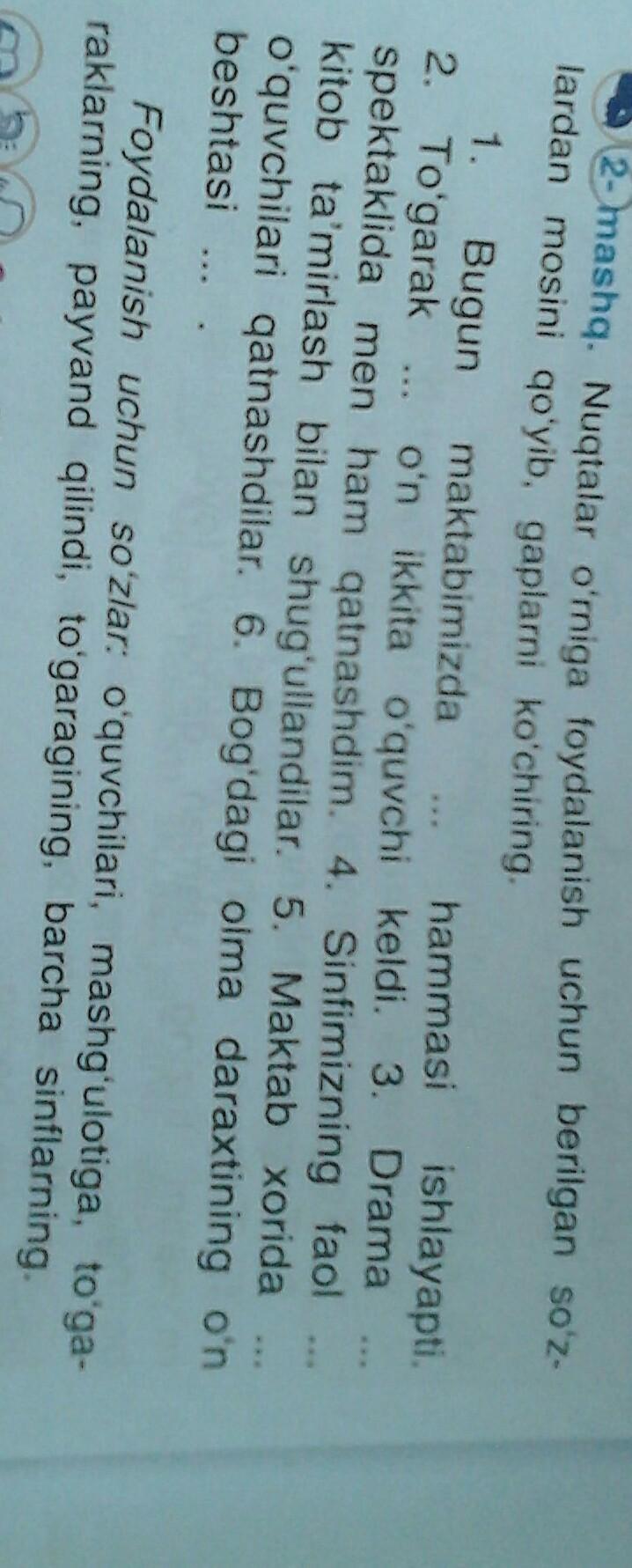 Nuqtalar õrniga foydalanish uchun berilgan soz - lardan mosini qoyib,gaplarni kochiring. Пожалуйста помогите срочно нужен