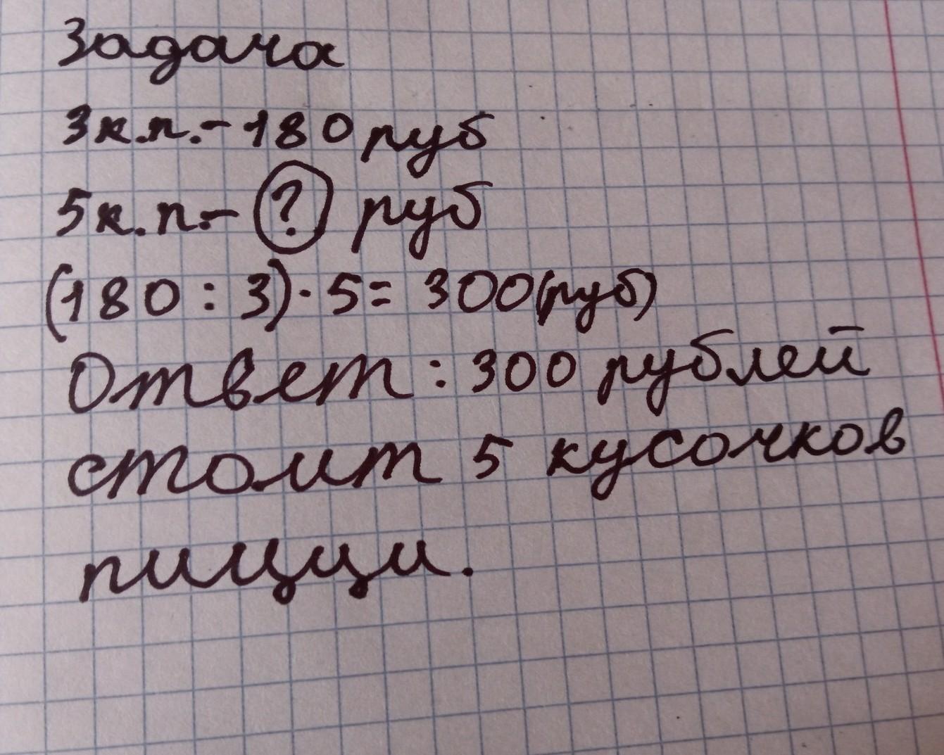 3 кусочка пиццы стоят 180 рублей сколько стоят 5 кусков пиццы? пропорции