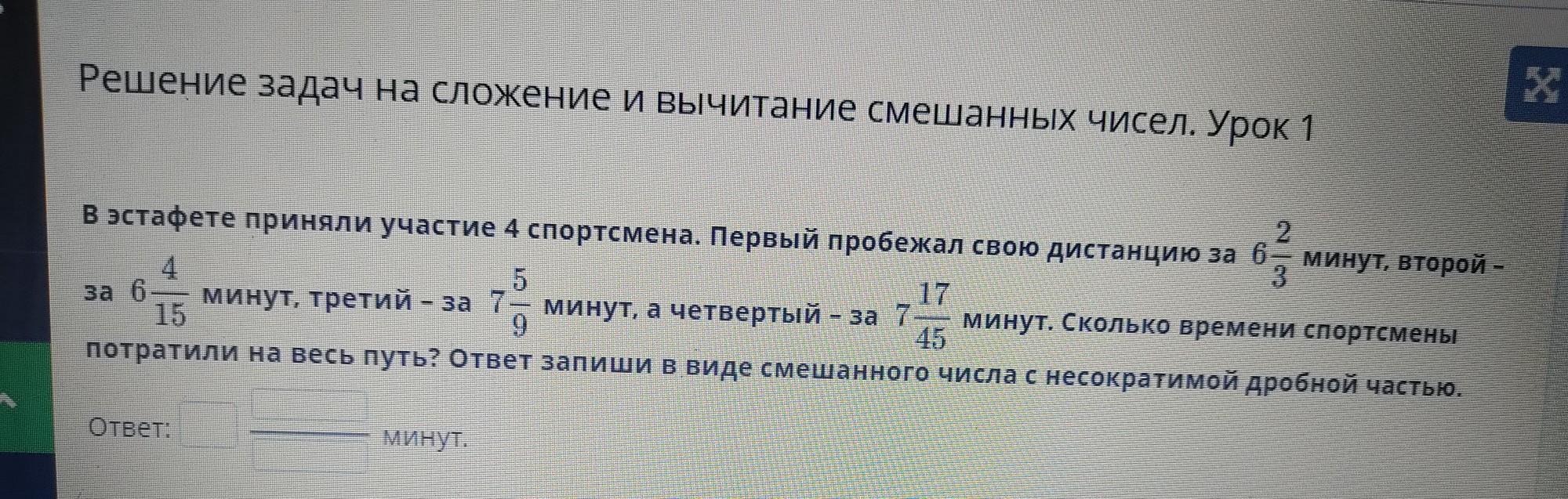 Решение задач на сложение и вычитание смешанных чисел. Урок 1 В эстафете приняли участие 4 спортсмена. Первый пробежал свою дистанцию за 6 2 минут, второй – 4 5 за 6- о минут, третий - за 7 минут, а четвертый - за 7- 15 минут. Сколько времени спортсмены 45 потратили на весь путь? Ответ запиши в виде смешанного числа с несократимой дробной частью. 7 17
