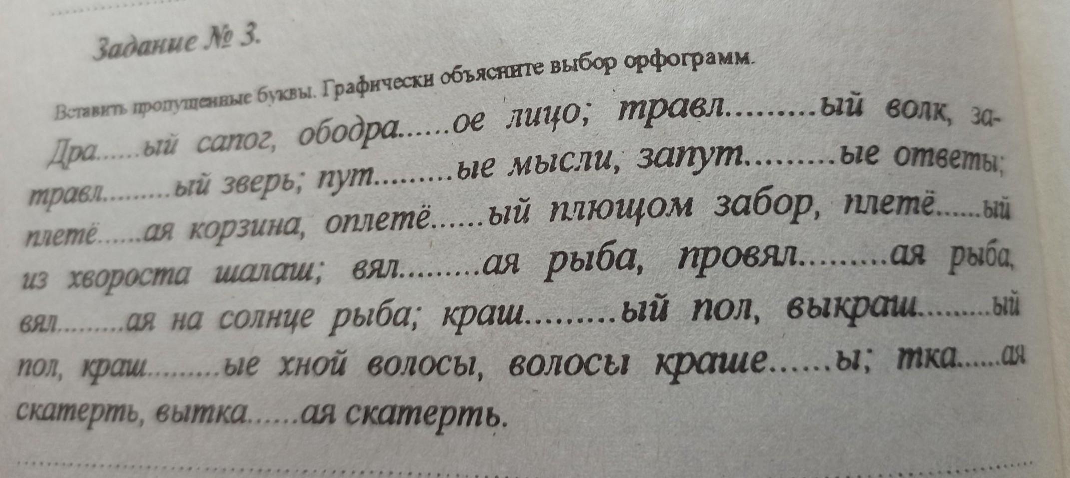 ПОМОГИТЕ,ПОЖАЛУЙСТА!ДАЮ 40 БАЛОВ. Задание № 3. Вставить пропущенные буквы. Графически объясните выбор орфограмм Дра......ый сапог, ободра......ое лицо; травл.........ый волк, затравл.........ый зверь; пут.........ые мысли, запут.........ые ответы, плете......ая корзина, оплетё......ый плющом забор, плете.....ый из хвороста шалаш; вял.........ая рыба, провял..........ая рыба вял.........ая на солнце рыба; краш.........ый пол, выкраш.......ый пол, краш...... ые хной волосы, волосы краше......ы; тка....ая Скатерть, вытка......ая скатерть.