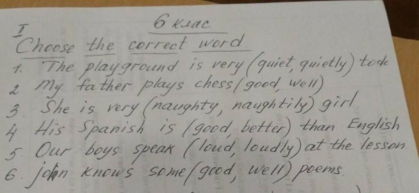 1. quıet 2. Well 3. naughty 4. better 5. loudly 6. good