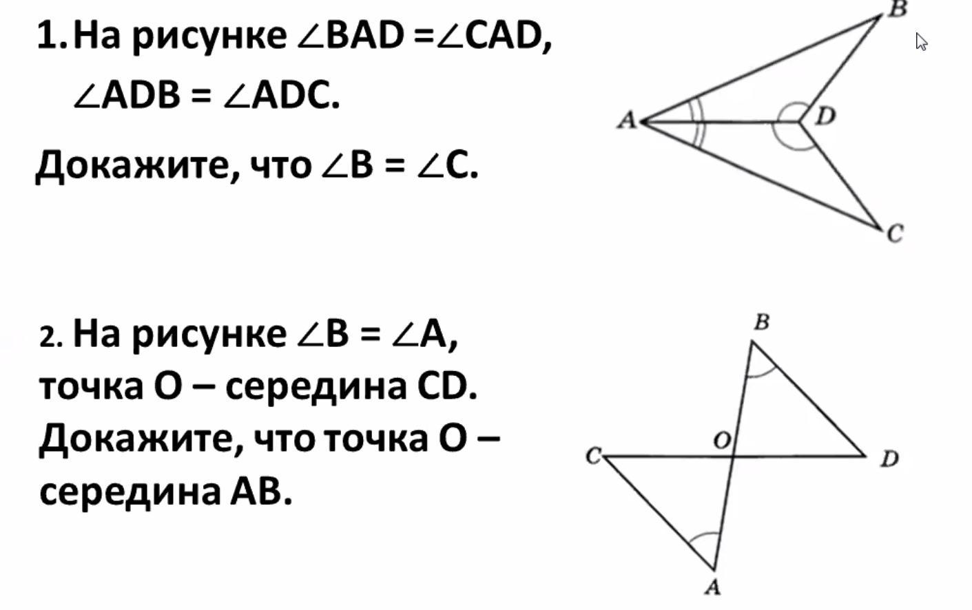 2 рассмотрим треуг BOD и треуг COA, в них: угол А= углу В, СО=ОD(по усл.), угол СОА= углу ВОD( как вертикальные). Из этого следует, что треуг ВОD= треуг COA. (по стороне и 2 углам)