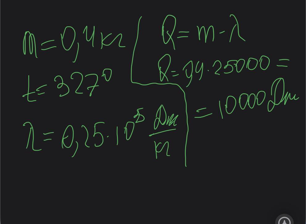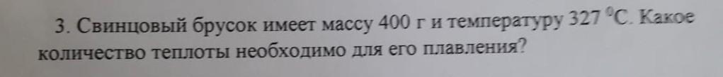 Q=λm=30000Дж/кг * 0,4 кг= 12000Дж=12 кДж (свинец плавится при 327°С, λ- удельная теплота плавления, из таблицы)