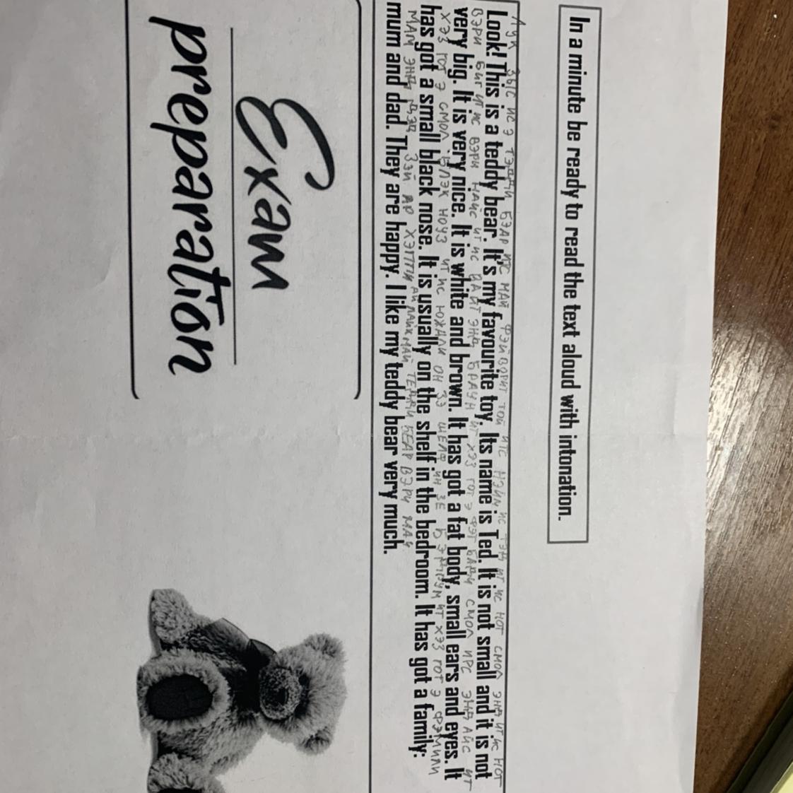 Смотри! Это плюшевый мишка. Это моя любимая игрушка. Его зовут Тед. Он не маленький и не очень большой. Это очень мило. Он бело-коричневый. У него толстое тело, маленькие ушки и глаза. У него маленький черный нос. Обычно он лежит на полке в спальне. У него есть семья: мама и папа. Они счастливы. Мне очень нравится мой плюшевый мишка.