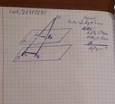 Плоскости α и β параллельны. Из точки M, не принадлежащей этим плоскостям и не находящейся между ними, проведены два луча. Один из них пересекает плоскости α и β в точках A1 и B1, а другой — в точках A2 и B2 соответственно. Найдите отрезок B1B2 , если он на 2 см больше отрезка A1A2 , MB1 = 7 см, A1B1 = 4 см.