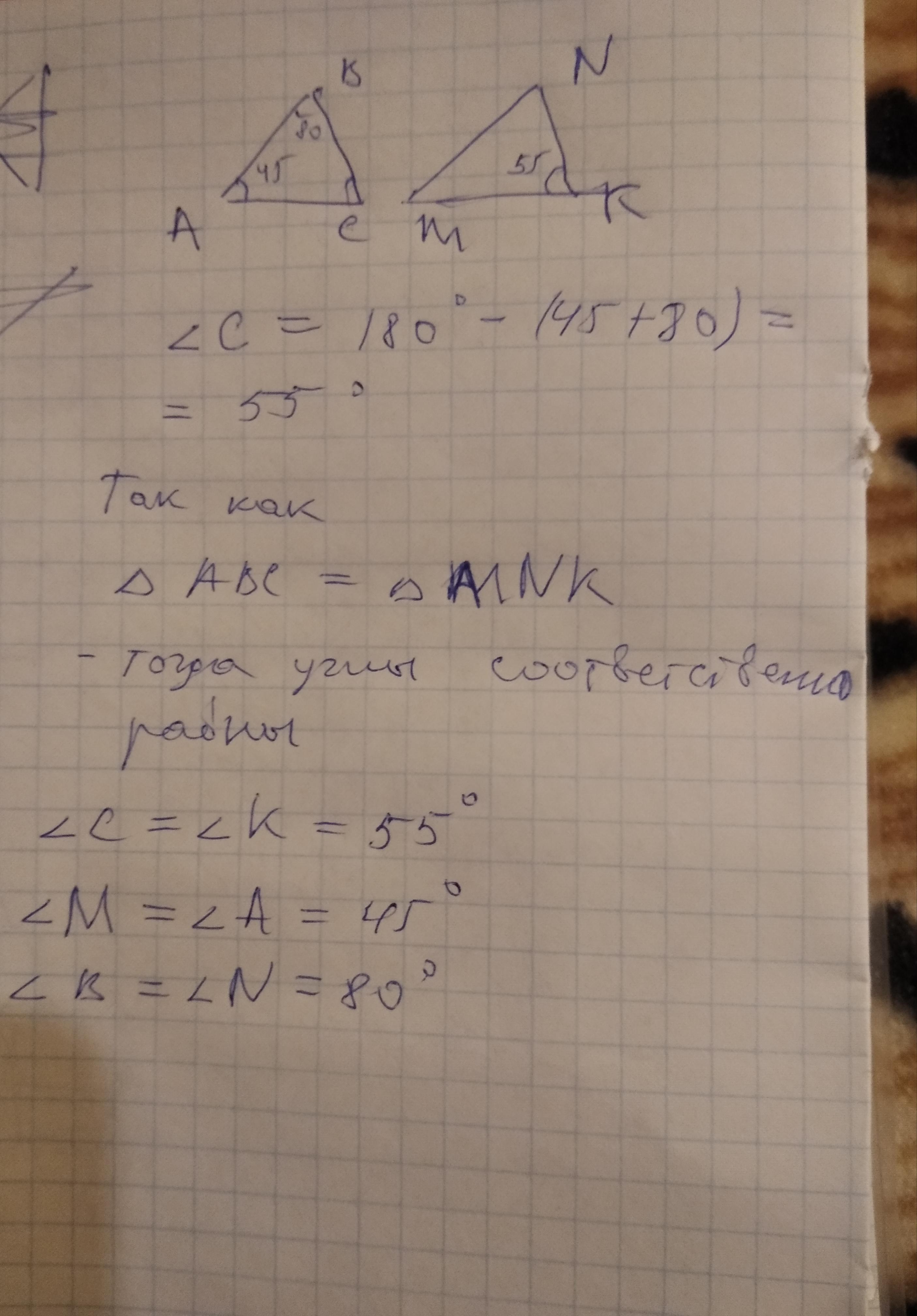 Відомо що трикутник ABC= трикутнику MNK; A=45 градусів; B=80 градусів; K=55 градусів. Знайдіть невідомі кути трикутників ABC i MNK