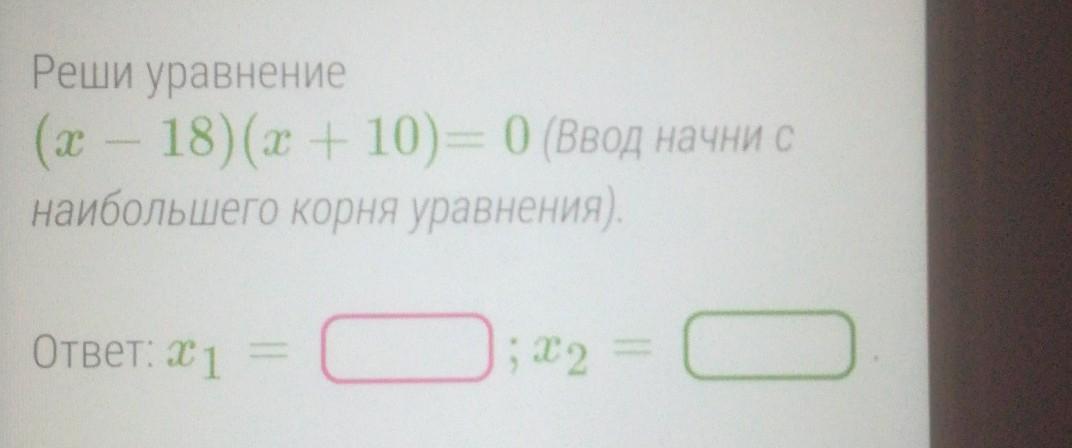 Реши уравнение (х - 18) (х + 10) = 0 (Ввод начни с наибольшего корня уравнения).