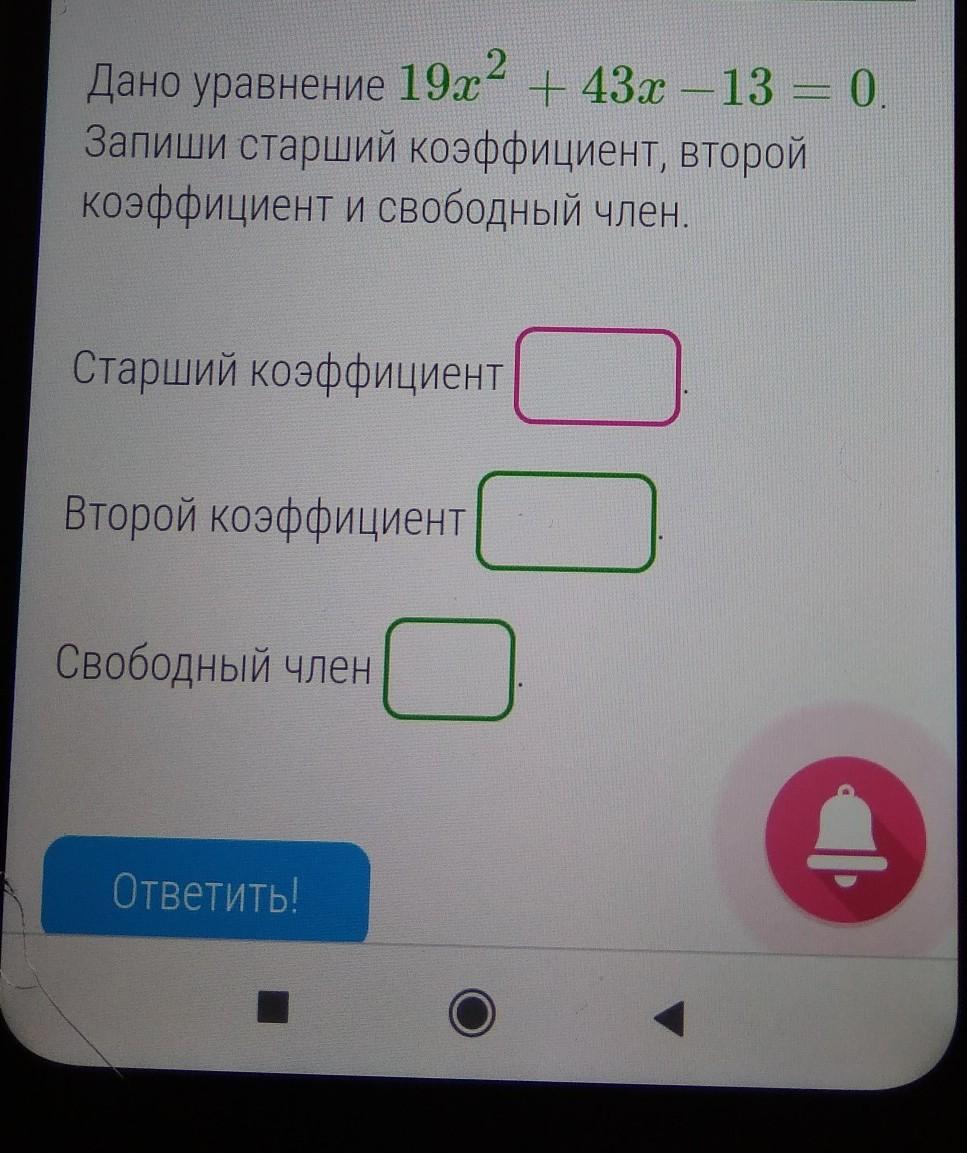 дано уравнение 19x²+43x-13=0 запиши старший коэффициент второй коэффициент и свободный член