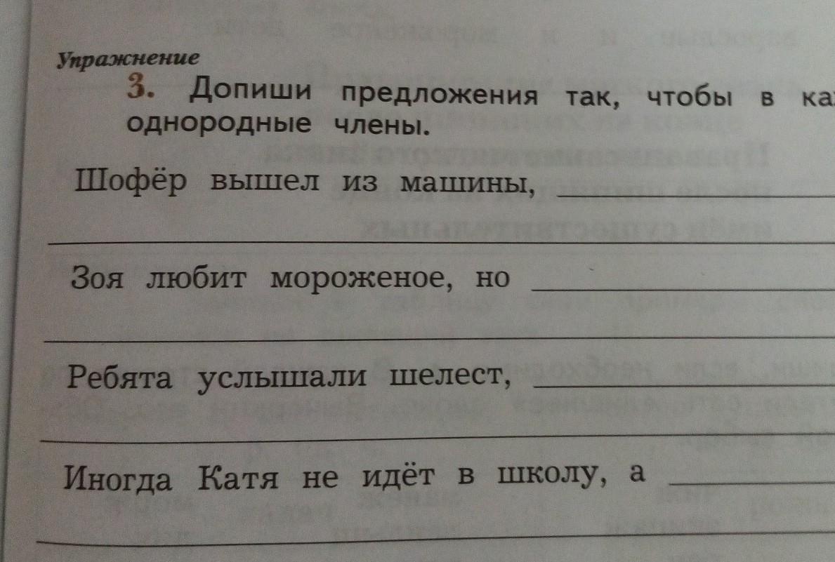 Упражнение 3. Допиши предложения так, чтобы в каждом были однородные члены. Шофёр вышел из машины,_____. Зоя любит мороженое,_____. но Ребята услышали шелест, Иногда Катя не идёт в школу, а_____.