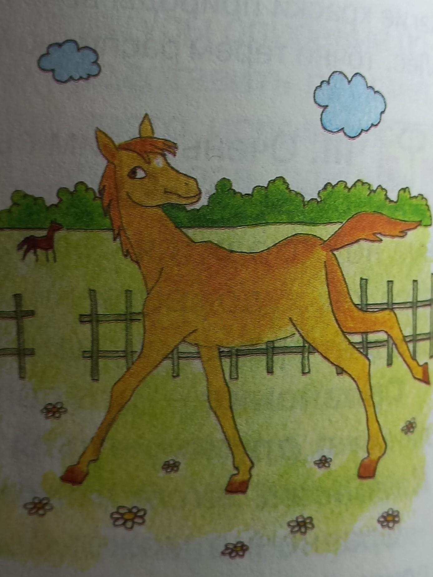 на улице как видно на картинке,лето. лошадка шла, и радовалась. на зелёной свежей траве были красивые ромашки.на заднем плане, мы видим забор, а рядом с забором была другая лошадка, которая скакала по полю. также, эта лошадка тёмного цвета.