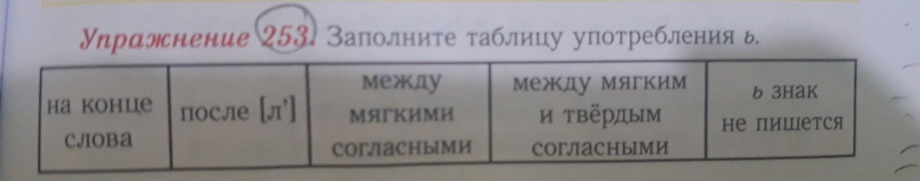 Упрожнение 253. Заполните таблицу употреблебления ь.