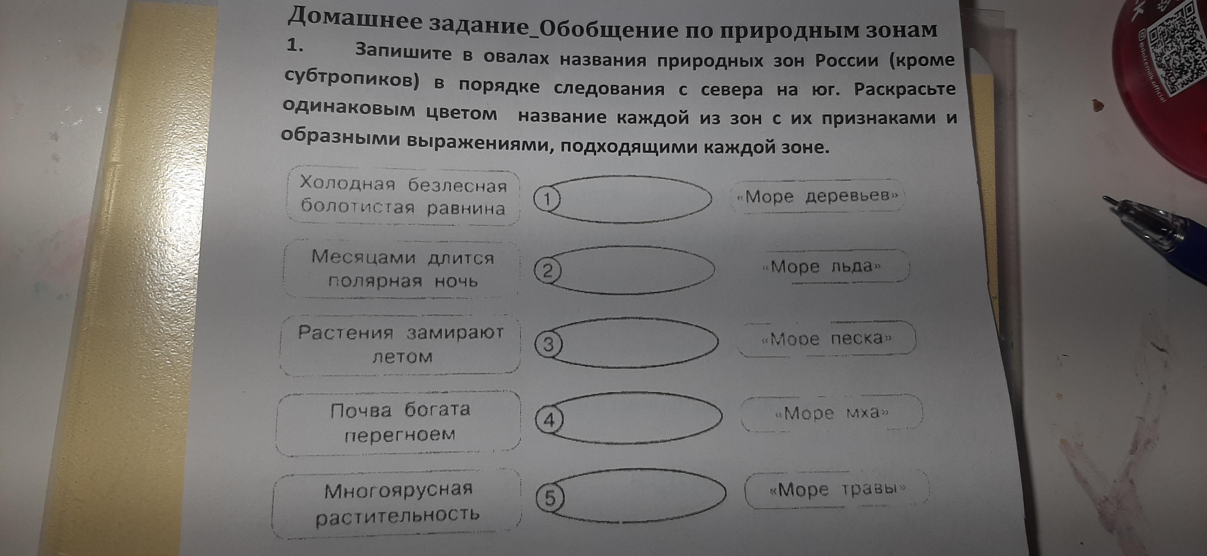 Помогите!!Запишите в подвалах названия природных зон России (кроме субтропиков)в порядке следования с севера на юг раскрасте одинаковым цветом название из каждой из зон с их признаками и образным выраженными, подходящими каждой зоне