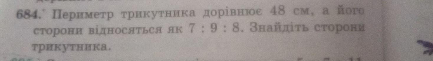 684. Периметр трикутника дорівнює 48 см, а його сторони відносяться як 7 : 9 : 8. Знайдіть сторони трикутника.