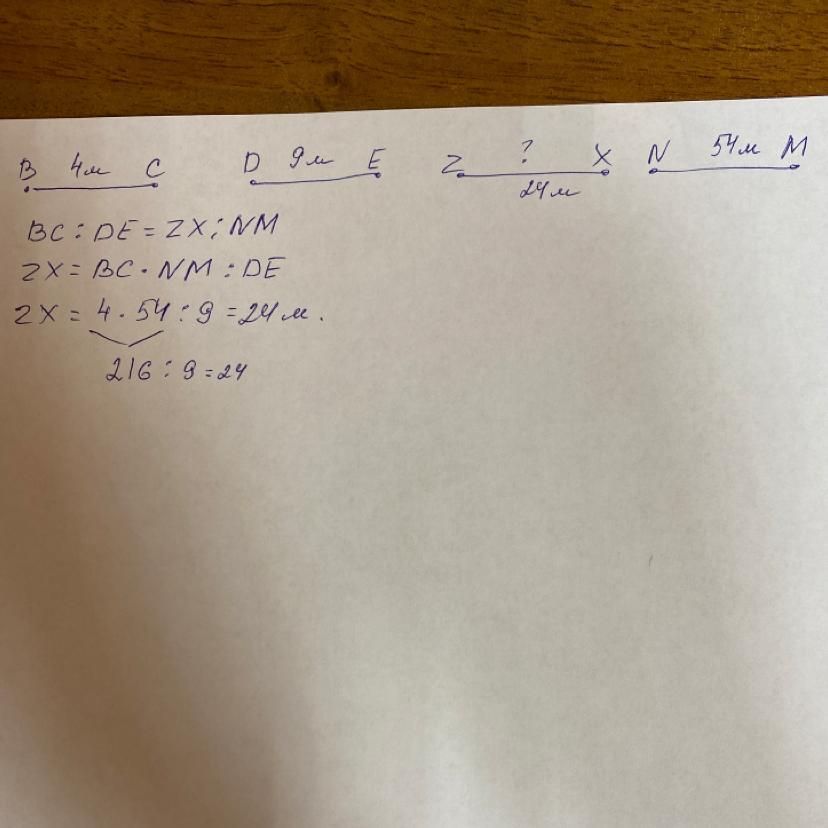 Известно, что отрезки BC, DE и ZX, NM по парам — пропорциональные отрезки.