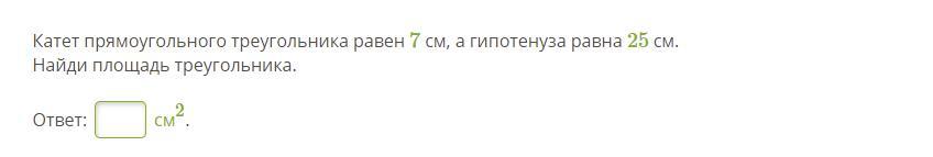Катет прямоугольного треугольника равен 7 см, а гипотенуза равна 25 см.