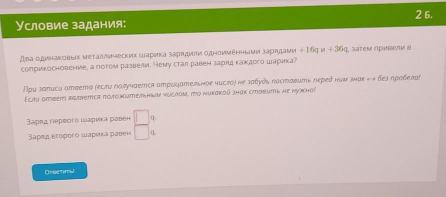 При соприкосновении двух металлических шариков их заряды распределились между ними пополам.