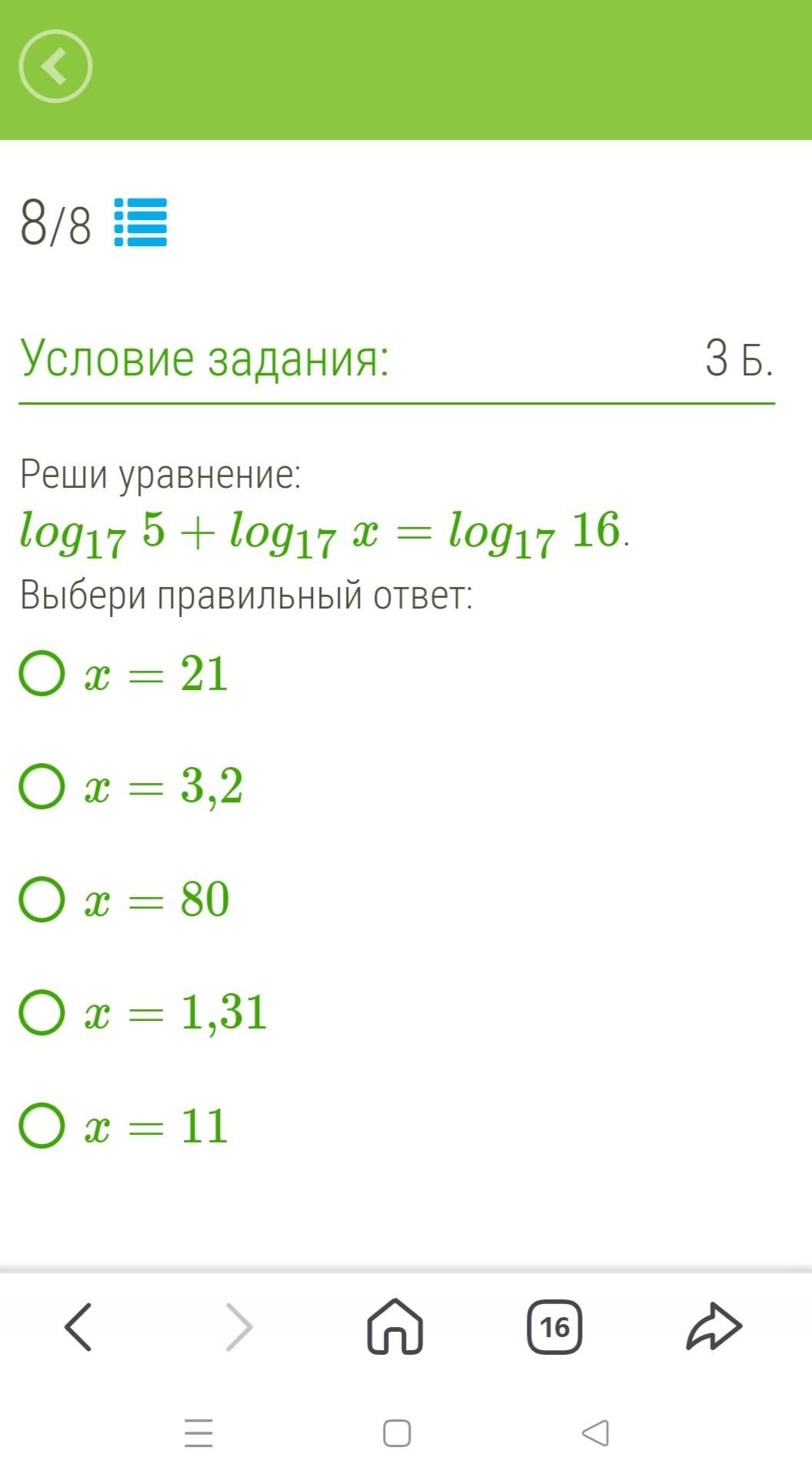 \displaystyle log_{17}(5)+log_{17}(x)=log_{17}(16),x>0\\log_1_7(5x)=log_1_7(16)\\5x=16\\\\ x=\frac{16}{5}=3\frac{1}{5}=3,2