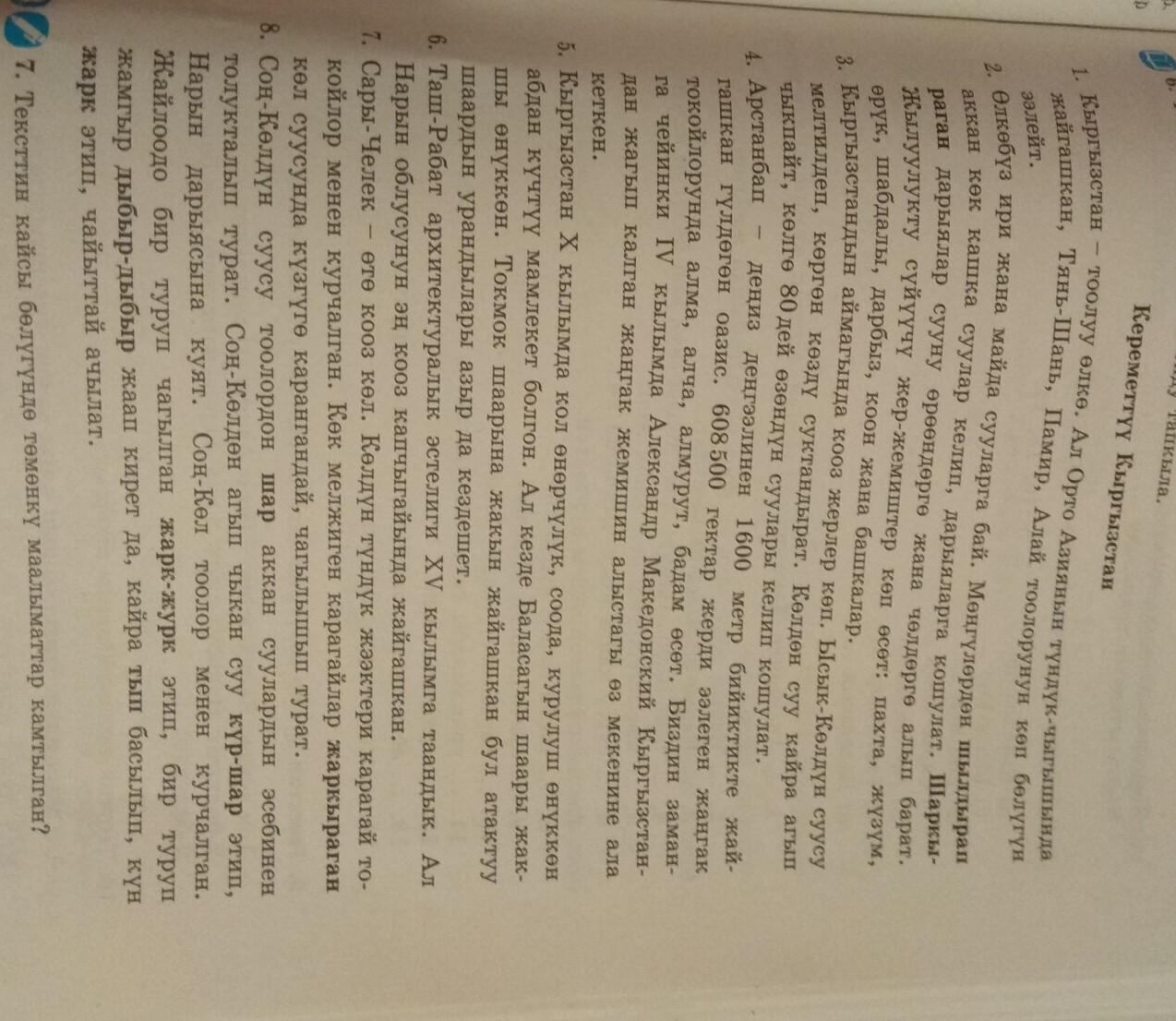 4 Ашыкчасын тап 1.... суусу агып чыгат, Нарын дарыясына кошулат 2... дарыяларга куят, өсүмдүктөрдүн сугарат 3... көптөгөн суулар келип куят, кайра агып чыкпайт а) Мөңгүлөр б) Сары-Челек в) Ысык-Көл г) Соң-Көл