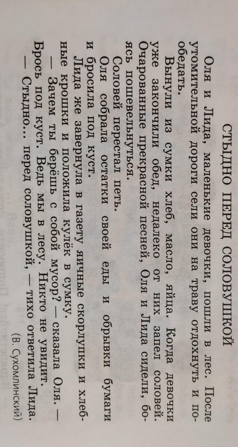 После утомительнной дороги сели они на траву отдохнуть и пообедать.Вынули из сумки хлеб, масло, яйца.Оля собрала остатки своей еды и обрывки бумаги и бросила под куст. Лида жезавернула в газету яичные скорлупки и положила кулёк в сумку.