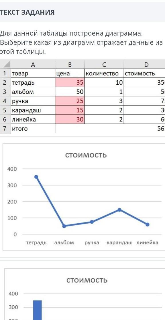 Для данной таблицы построена диаграмма. Выберите какая из диаграмм отражает данные из этой таблицы.