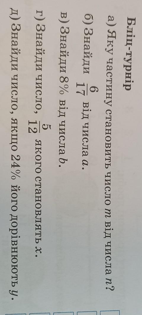а) Знайди число, якщо 24% його дорівнюють у. г) Знайди число, 5/12 якого становлять х. а) Яку частину становить число м від числа п? в) Знайди 8% від числа ь. б) Знайди 6/17 від числа а.