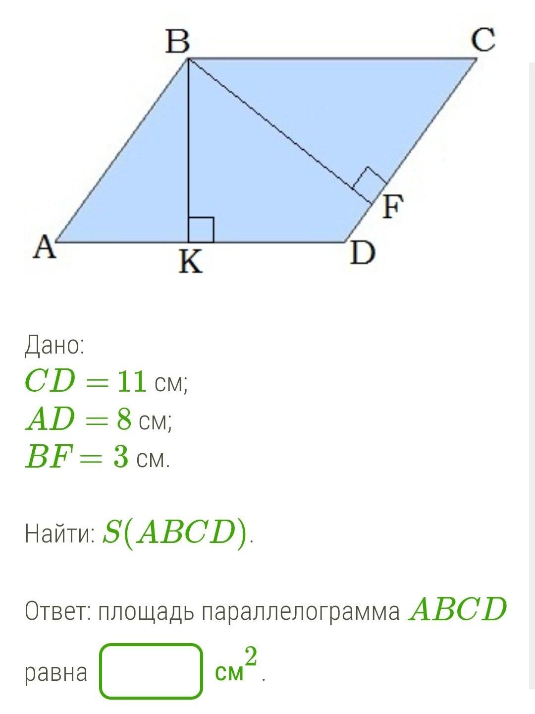 S(АВСD)=CD×BF=11×3=33 cм^2