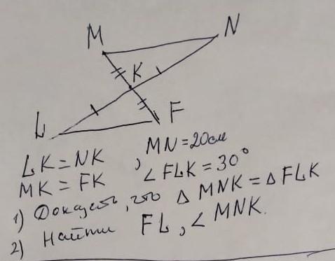 ΔMNK=ΔLFK Δпо двум сторонам ( LK=NK , MK=FK ) и углу между ними ( ∠MKN=∠FKL как вертикальные) .
